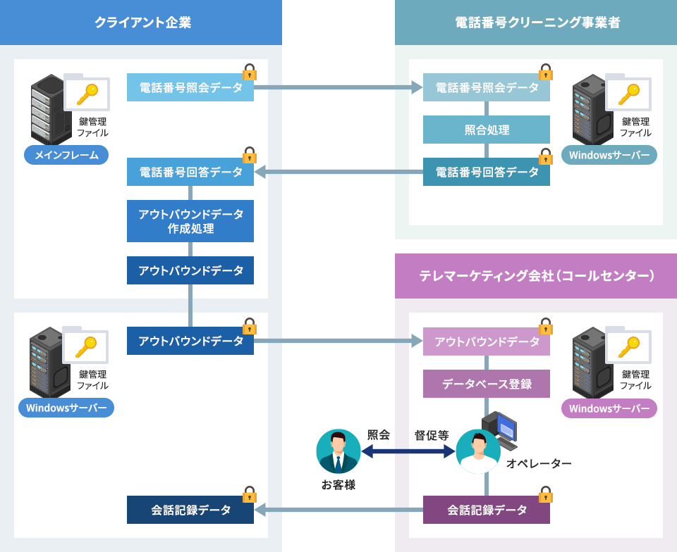 クライアント企業が電話番号クリーニング事業者およびテレマーケティング会社との間で授受するデータを保護する目的でご利用いただいております。更にクライアント企業では、テレマーケティング会社との頻繁なデータ授受のリスク対策として、コマンドでの自動運用および鍵管理オプションで自動的に暗号鍵の定期更新をしております。