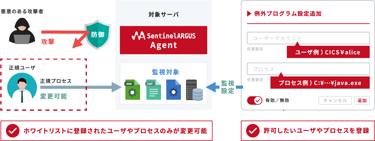 SentinelARGUSは、守りたい対象を指定し、正規のユーザやプロセスのみが変更できるようにすることで、データやシステムを確実に守ります。ホワイトリスト方式で、業務に支障なく運用でき、簡単な設定で高い防御力を実現する革新的な製品です。