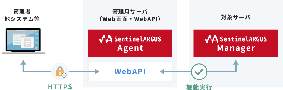 管理用サーバと対象サーバ間はTLS通信+TLSクライアント認証により保護されたセキュアな通信方式を使用しているため、成りすましや盗聴の心配もありません。