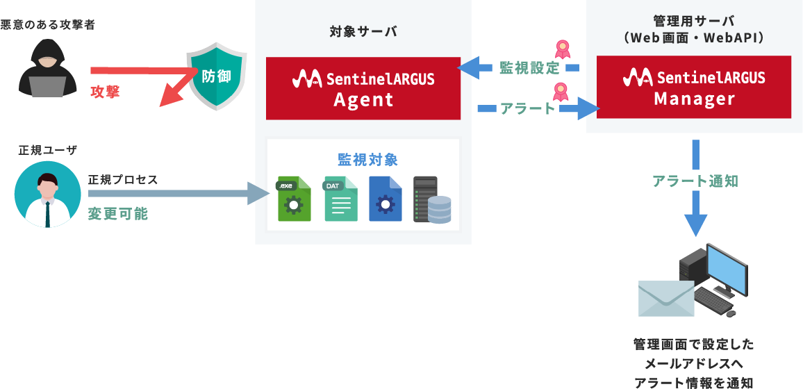 管理用サーバから監視対象(保護対象)を設定することでイミュータブル化されます。設定後は例外対応を行った正規ユーザ・正規プロセスのみ変更が許可されます。